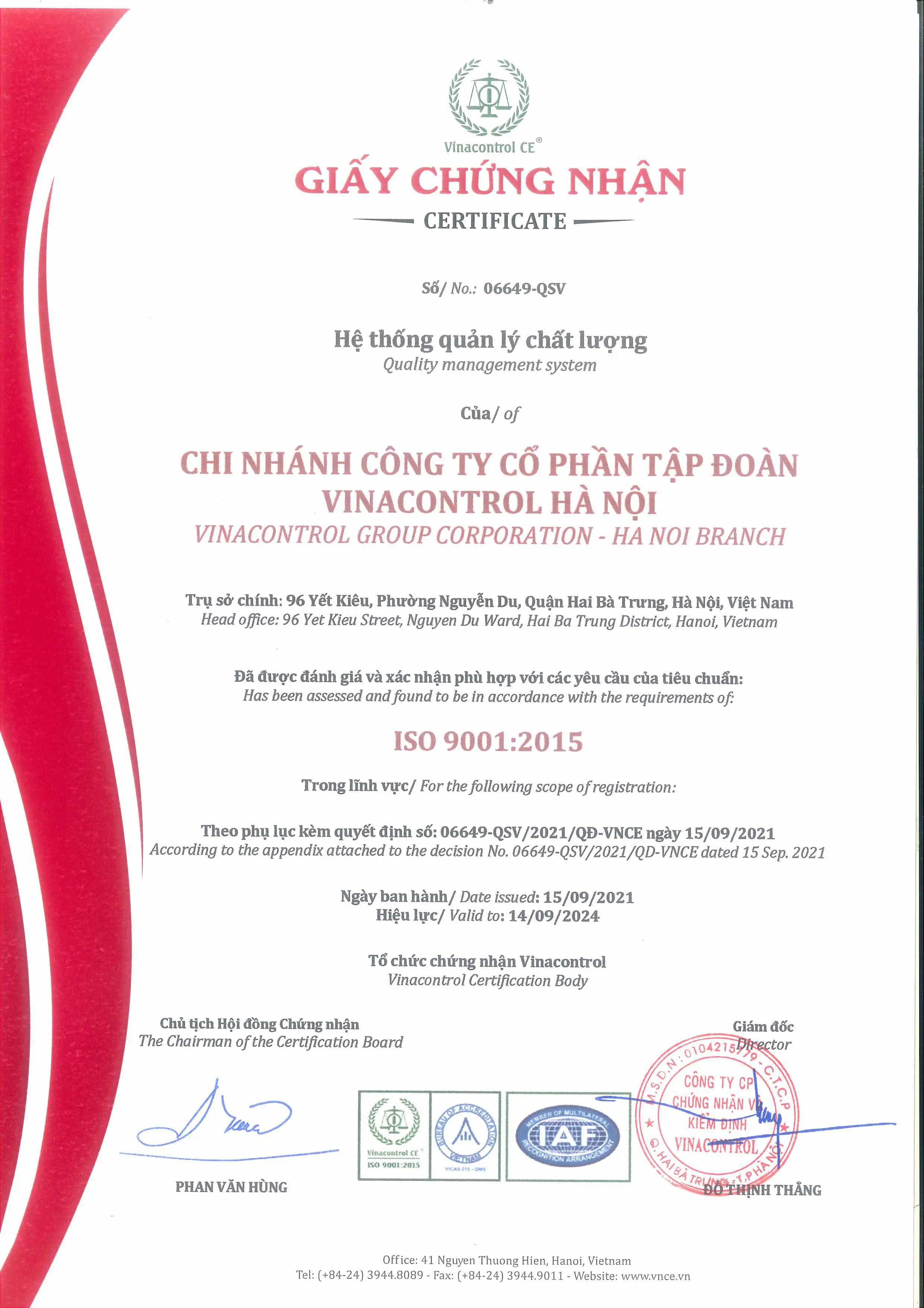 ISO 9001: 2015 - Vinacontrol Hà Nội